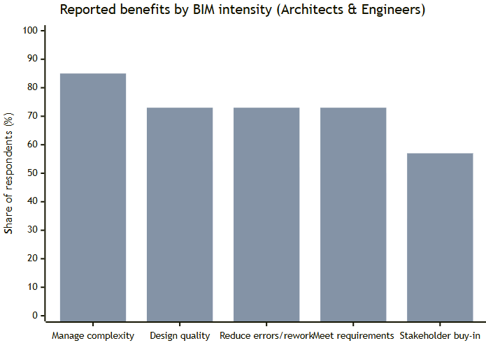 The SmartMarket data below illustrates why BIM delivery mindsets persist: high BIM intensity correlates with stronger reported benefits among architects/engineers (not proof of causation, but a strong organizational incentive). [10]